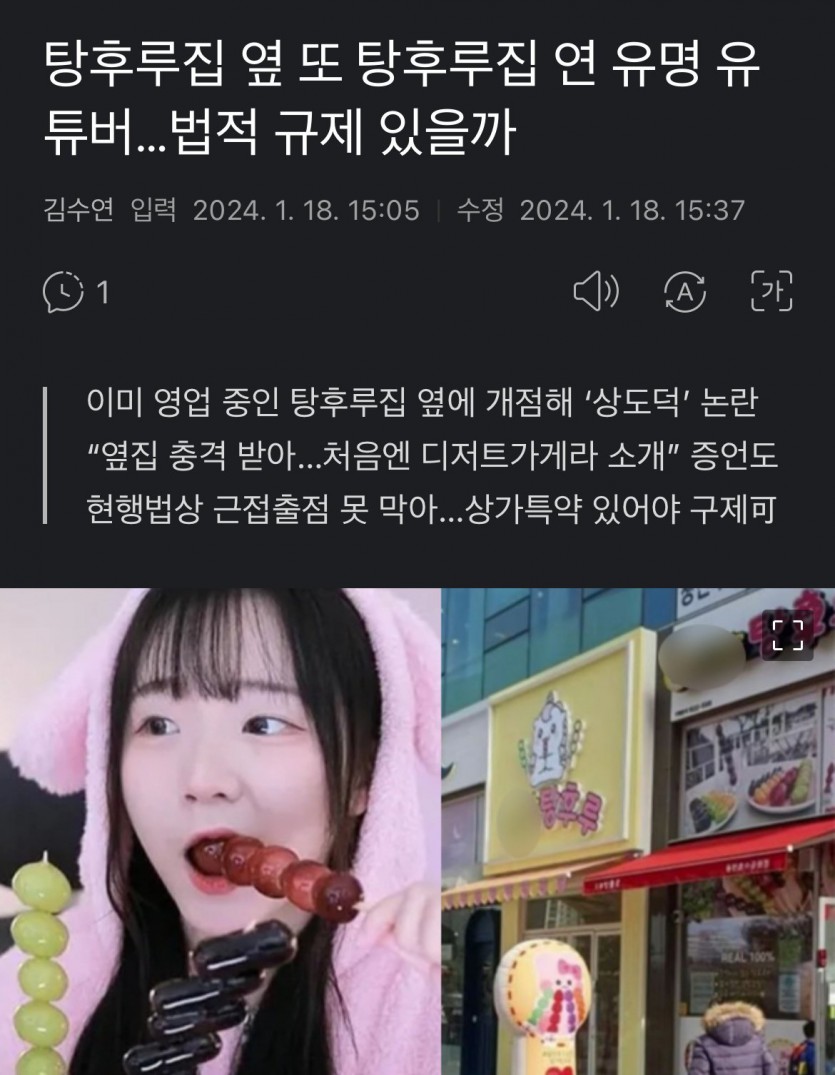 장 변호사는 “편의점 등은 근접 출점을 막는 자율규약을 편의점 연합끼리 시행하고 있는데, 다른 업종에서는 이런 경우가 많지 않다”며 “(탕후루) 피해 점주 측에서 손해배상 소송을 제기해 볼 수도 있겠으나 실제 매출 감소 등 확실한 피해를 입증해야 해 과정이 길고 힘들 수 있다. 영업의 자유가 있어 현재로선 (동종 점포) 개점 자체를 막을 순 없다”고 덧붙였다.