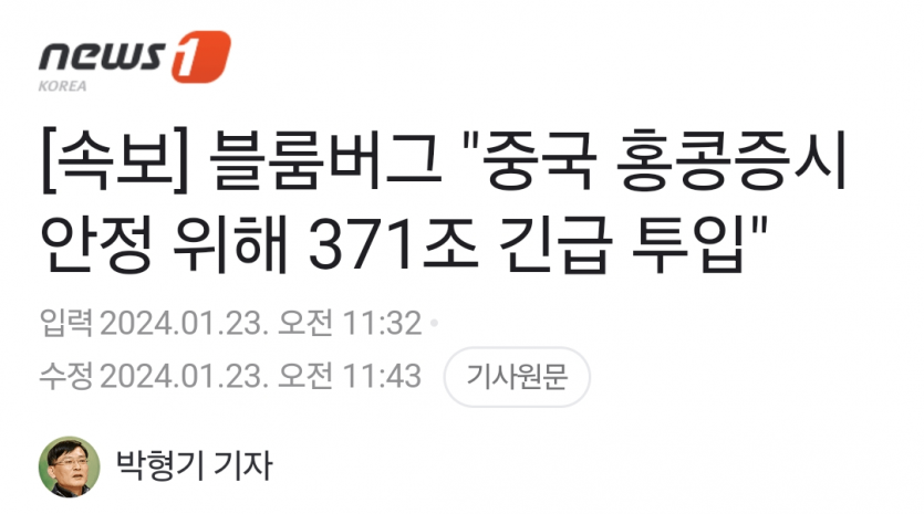블룸버그 "중국 홍콩증시 안정 위해 371조 긴급 투입"