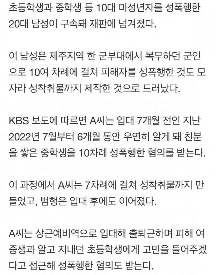 현역 군인이 여중생 10차례 성폭행, 초등학생도 건드렸다