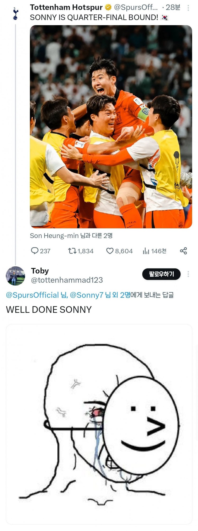 손흥민 8강 소식에 토트넘 팬 반응