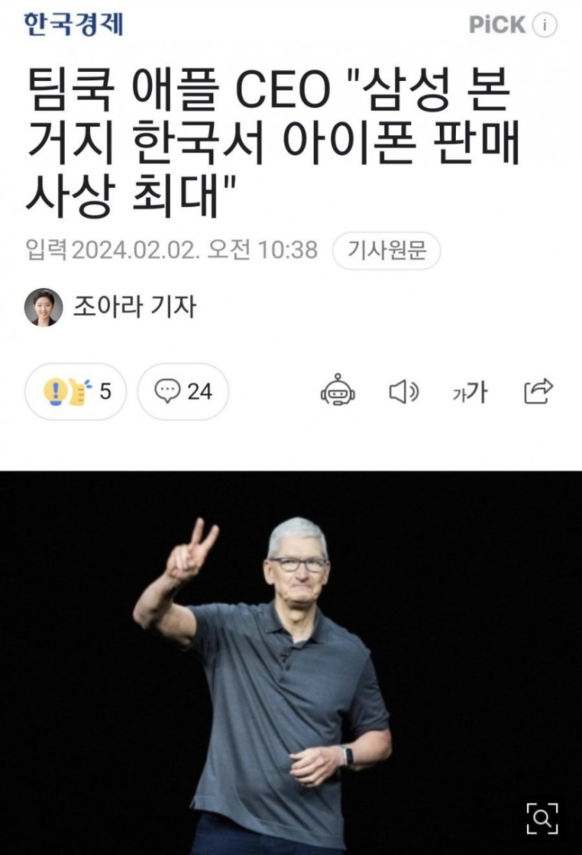 팀쿡 애플 CEO "삼성 본거지 한국서 아이폰 판매 사상 최대".jpg