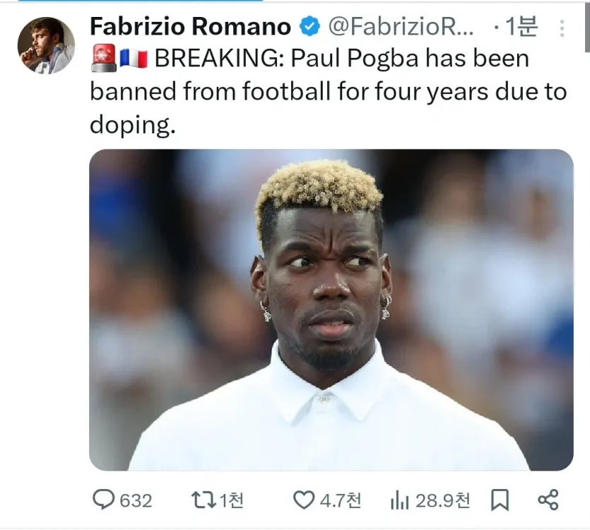 [속보] 폴 포그바 도핑혐의로 축구 4년간 정지