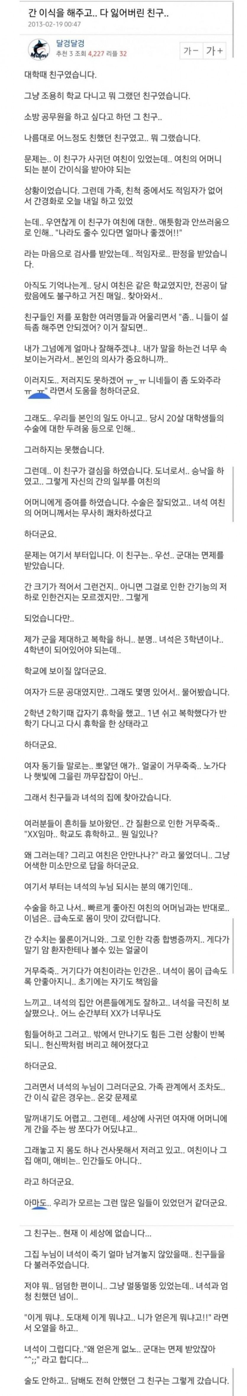 여친 엄마한테 간 기증하고 사망했다는 썰 ㄷㄷㄷ
