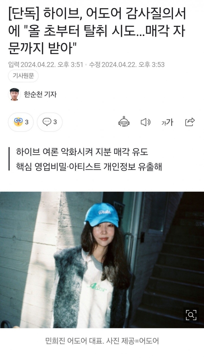 [단독] 하이브, 어도어 감사질의서에 "올 초부터 탈취 시도…매각 자문까지 받아"