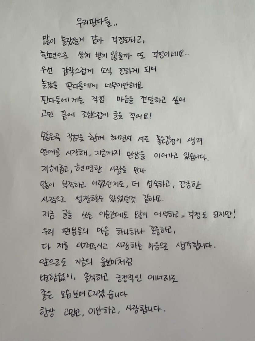 [열애인정] 에이핑크 윤보미가 방금 공식팬카페에 올린 편지
