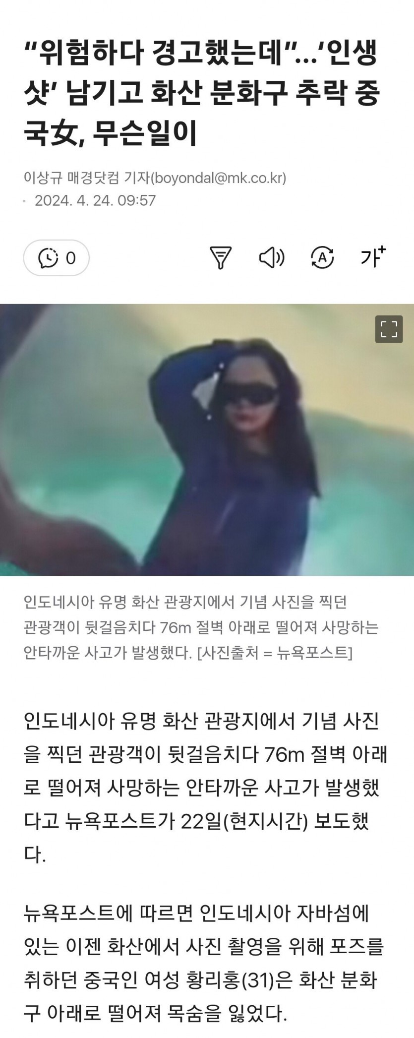 위험하다고 경고 했는데 인생샷 남기고 화산 분화구 추작한 중국여성