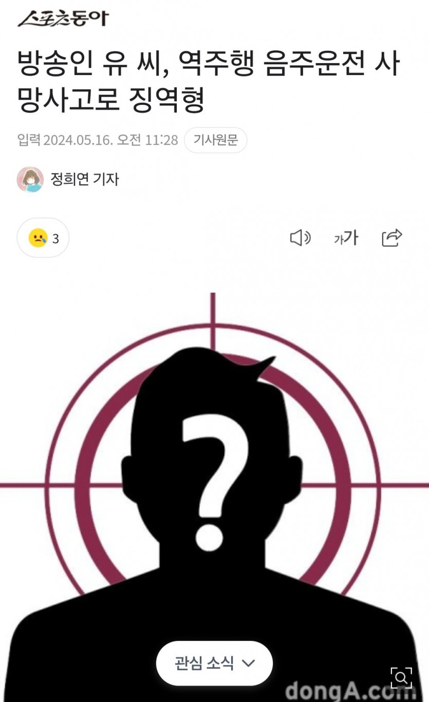 방송인 유 씨, 역주행 음주운전 사망사고로 징역형