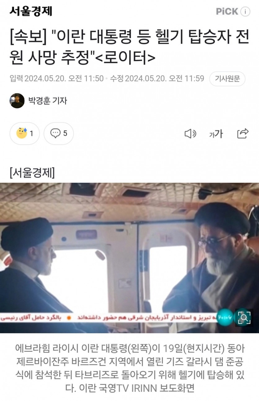 [속보] "이란 대통령 등 헬기 탑승자 전원 사망 "<로이터>