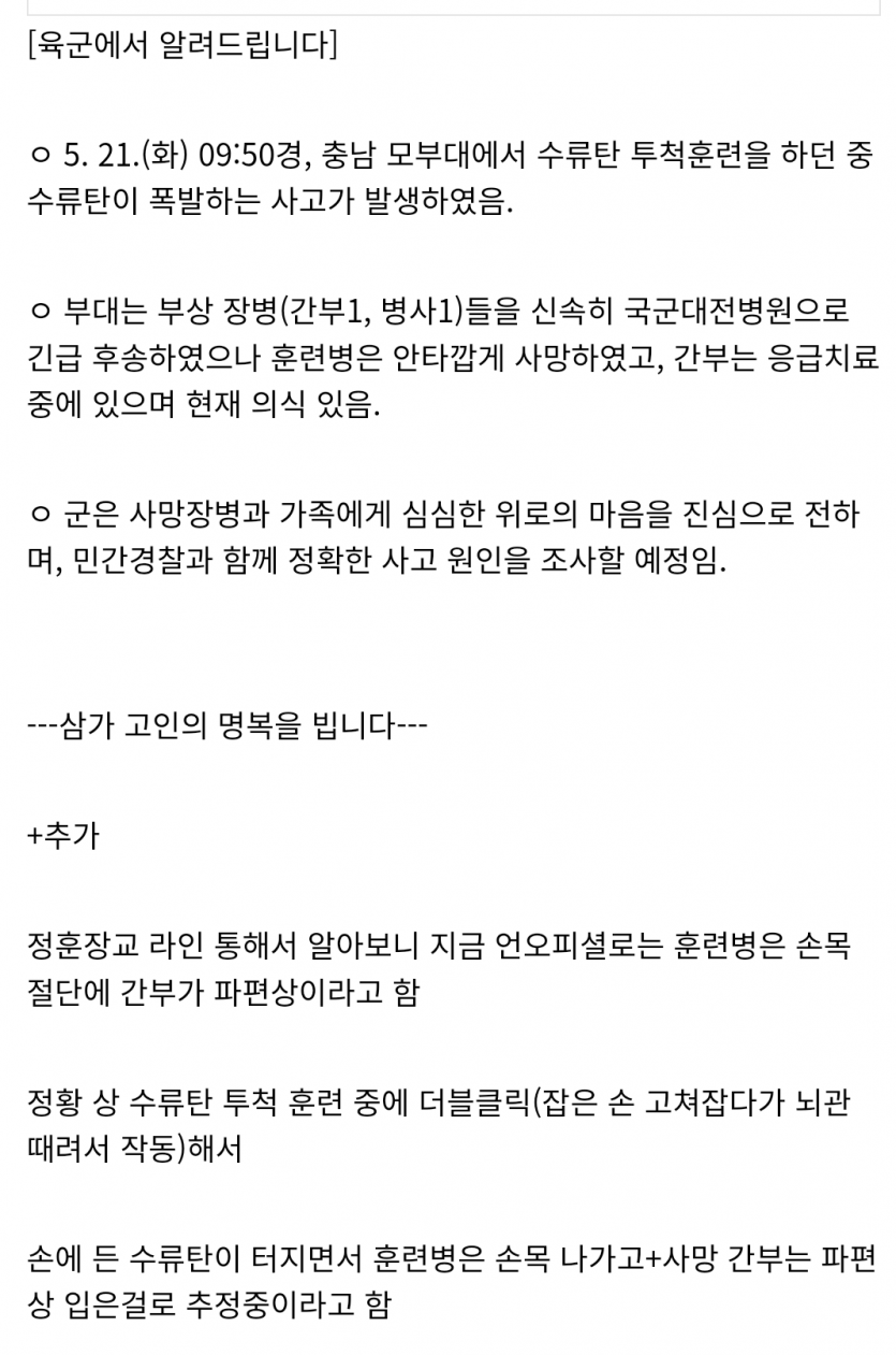 충남 훈련소 수류탄 사고 원인 떴음.