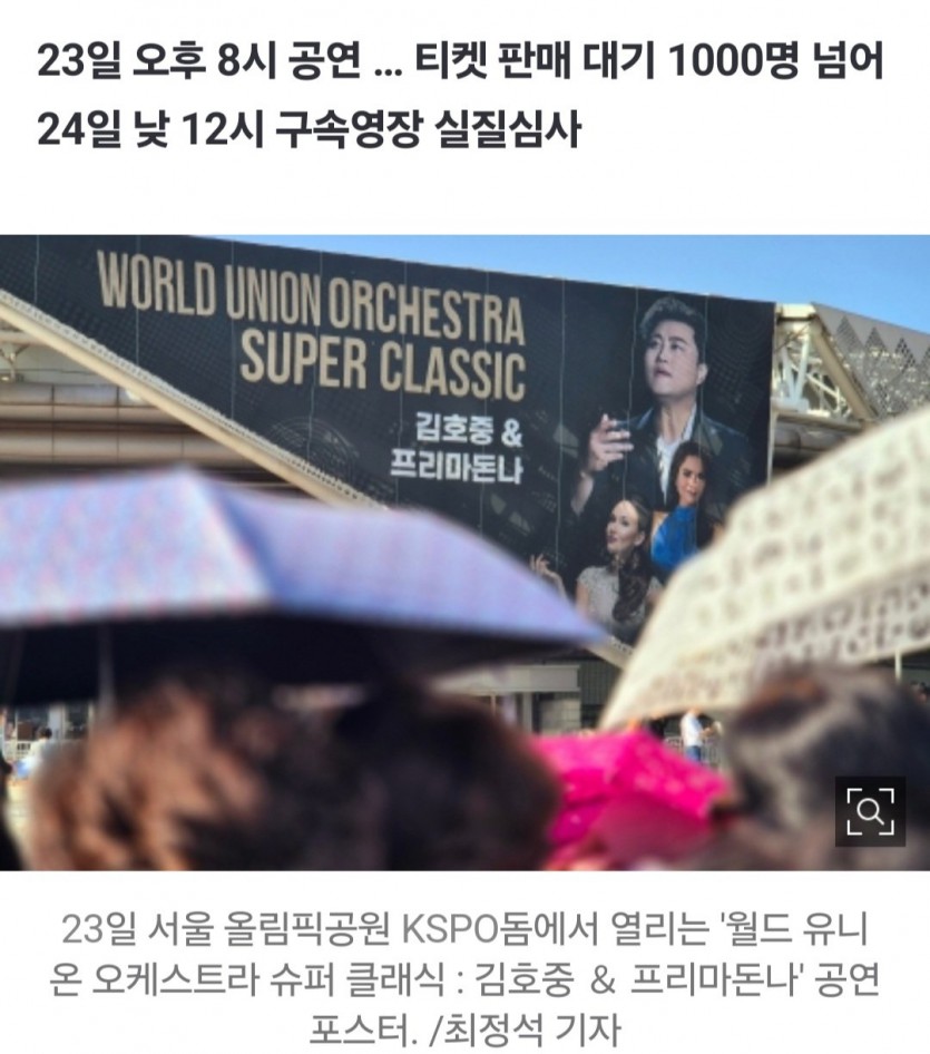 김호중은 이날 오후 8시 올림픽 체조 경기장에서 열리는 ‘월드 유니온 오케스트라 슈퍼 클래식 : 김호중 & 프리마돈나’(슈퍼 클래식)에 출연한다. 이 공연은 이날과 다음 날(24일)에 모두 열릴 예정이지만 김호중은 24일 구속영장 실질심사에 참석해야 하기 때문에 사실상 이날만 출연할 수 있을 것으로 보인다