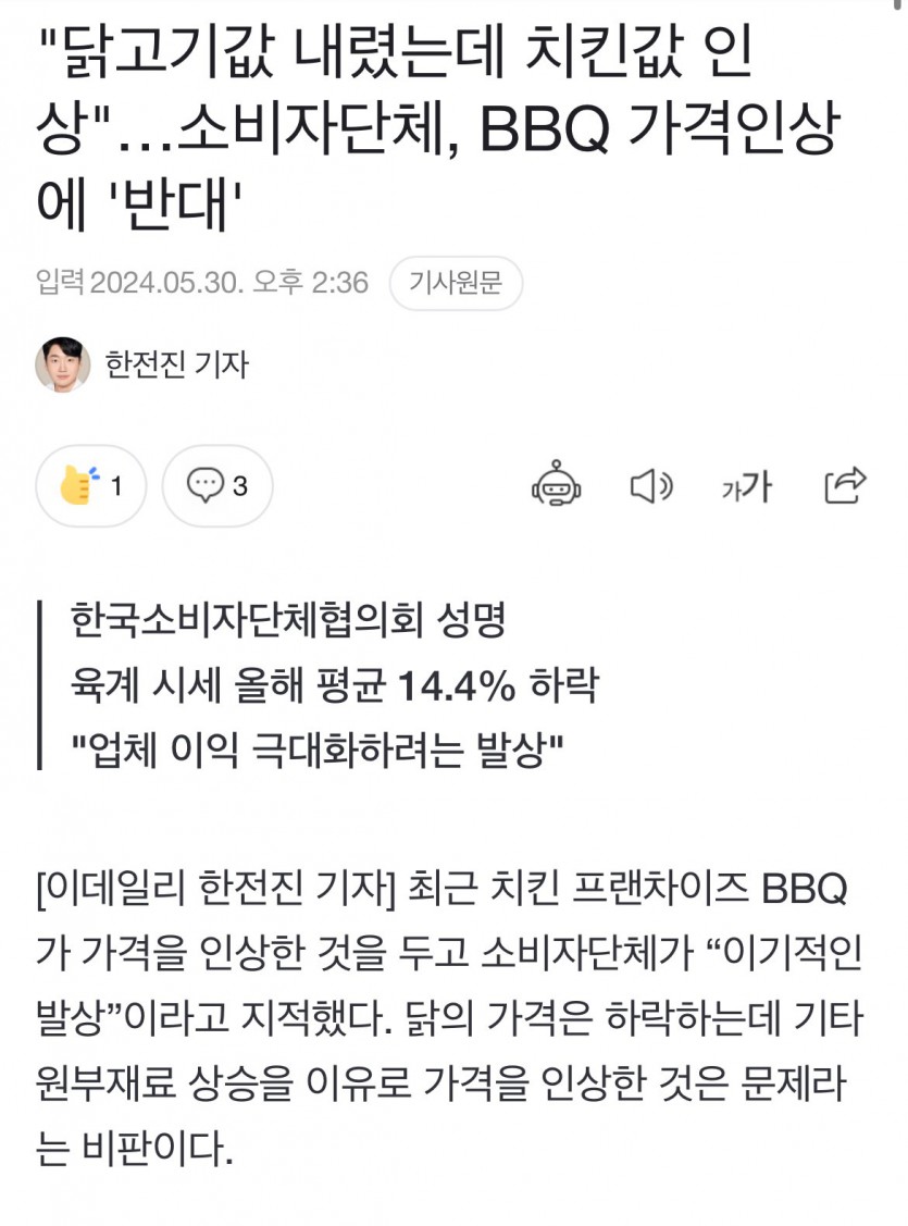육계 14.4% 하락인데 BBQ 가격인상