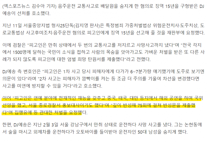 강남 벤츠 음주운전' DJ예송, 15년 구형에 "국위선양" 선처 호소
