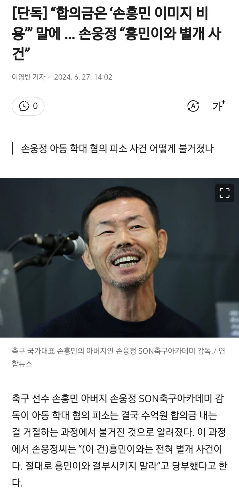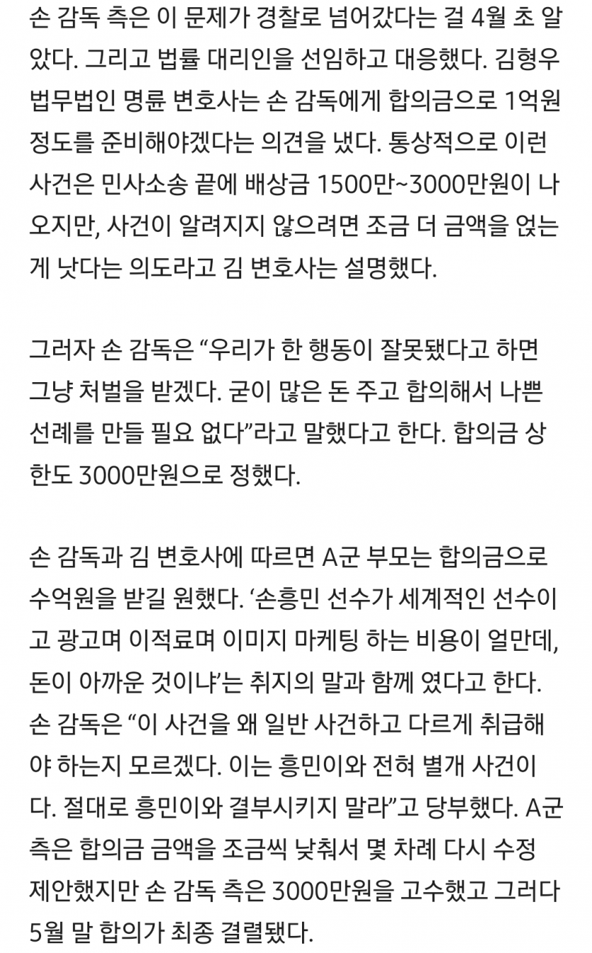 [단독] “합의금은 ‘손흥민 이미지 비용’” 말에 ... 손웅정 “흥민이와 별개 사건”