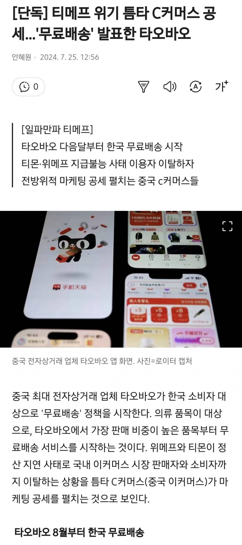 [단독] 티메프 위기 틈타 '무료배송' 발표한 타오바오