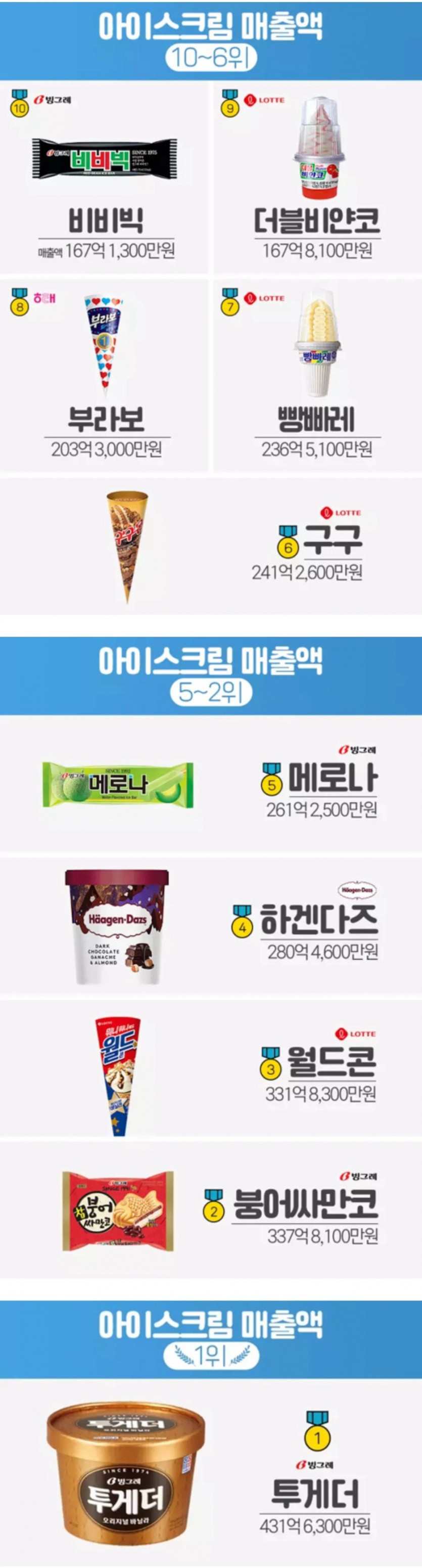 한국 아이스크림 매출액 1~10위