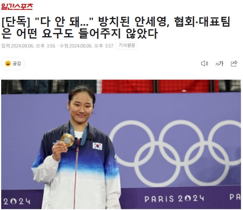 안세영은 대표팀 관리 방침에 신뢰가 떨어지기 시작했다. 갈등도 커졌다. 부상을 당해 불안감이 커진 상태에서 돌파구를 위한 요청은 코칭스태프와 협회에 의해 거의 묵살됐다.