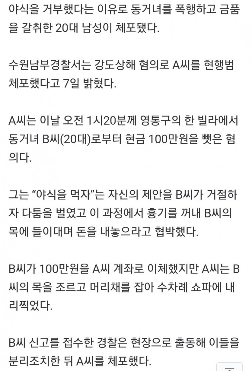 야식을 거부해?" 동거녀 폭행하고 100만원 강탈한 20대