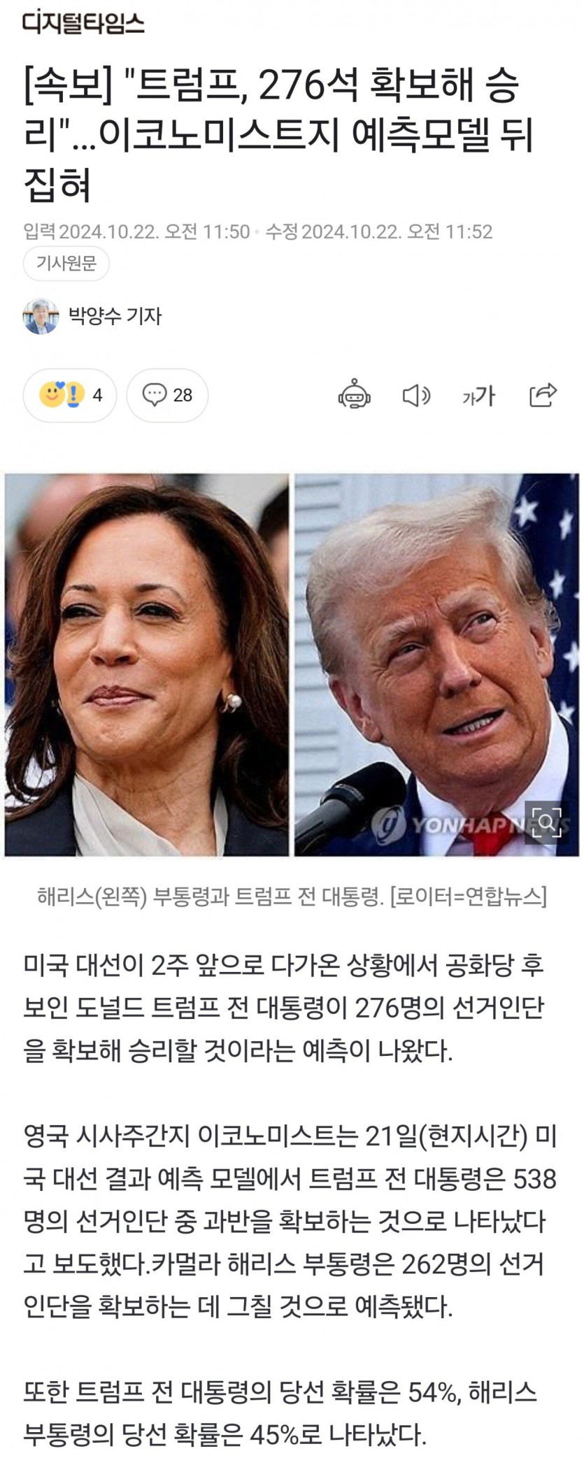 [속보] "트럼프, 276석 확보해 승리"…이코노미스트지 예측모델 뒤집혀