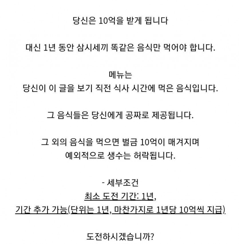 1년 동안 똑같은 음식만 먹고 10억 받기도전 가능?
