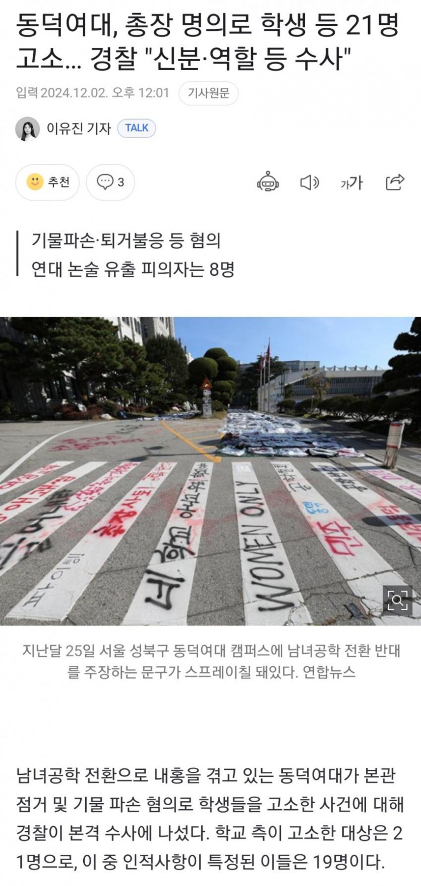 속보)동덕여대 총장 명의로 학생 등 21명 고소...