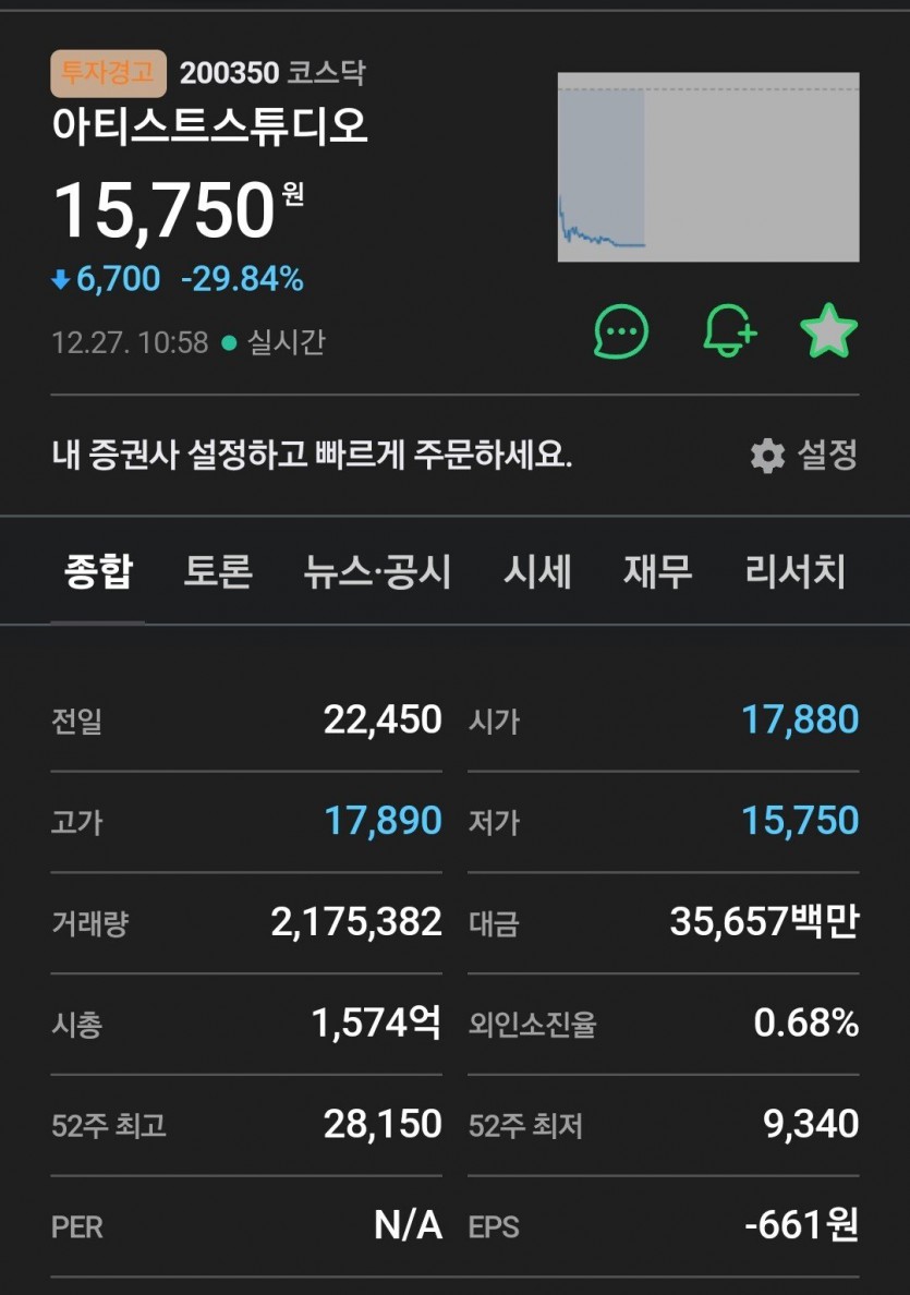 오징어게임 관련주 이정재 회사 주식 하한가JPG