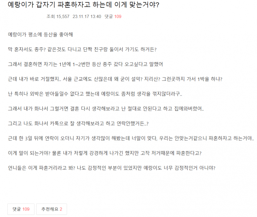 갑자기 파혼하자는 남자친구 때문에 당황한 여자