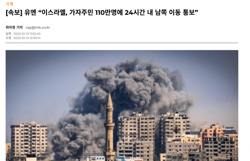 유엔 .. 이스라엘 가자주민 110만명 24시간안에 남쪽 이동 통보하다.. 이제 마무리 지으려나보다..