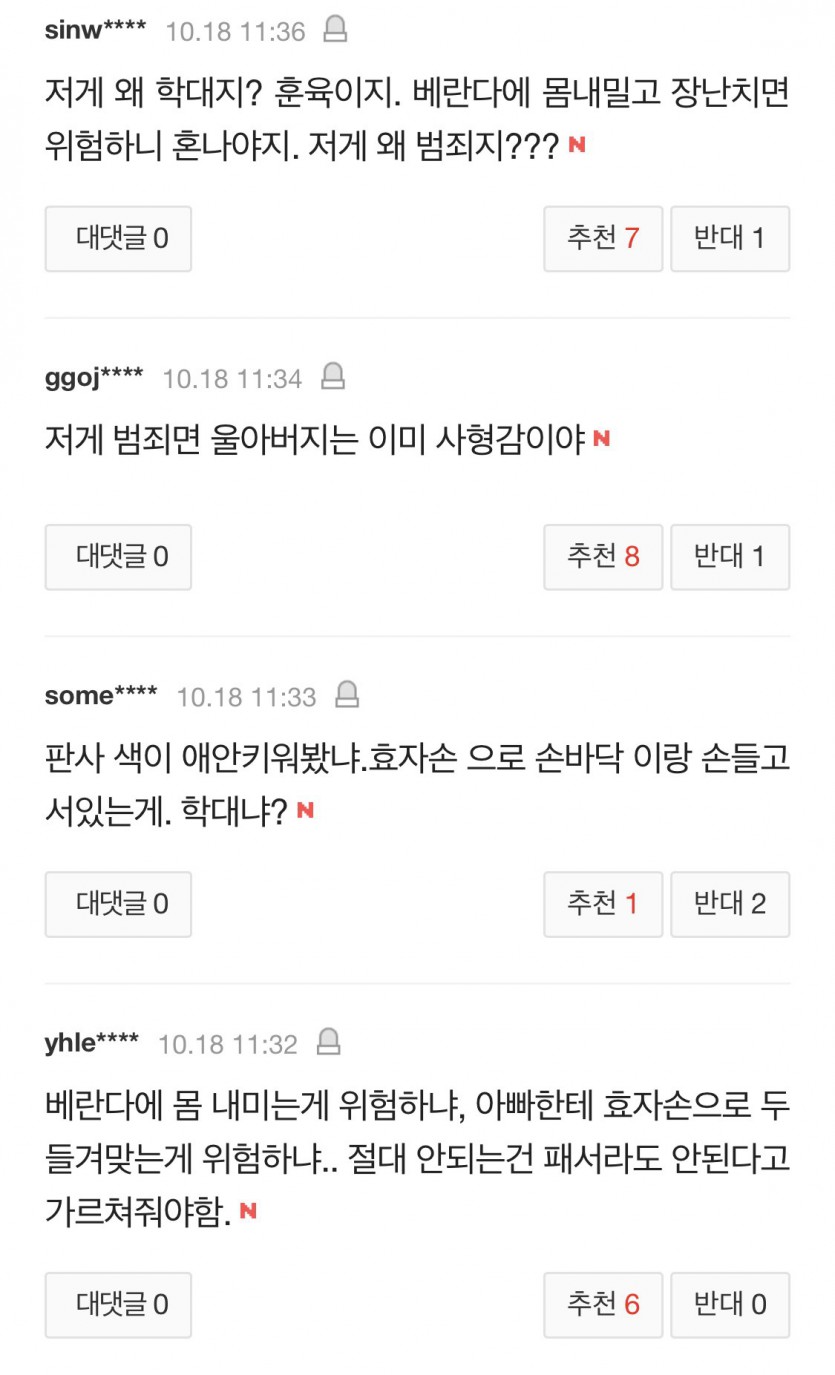 코로나18 작성일저정도면 훈육 아닌가???이제 훈육도 제대로 못하는 시대인거야??