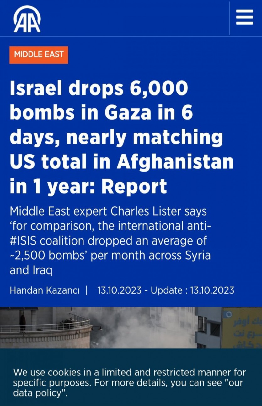10월 13일까지 6일동안 이스라엘 군이 가자지구에 쓴 폭격양이 미국이 아프가니스탄 전쟁 1년동안 쓴 폭격양이랑 비슷하다고.