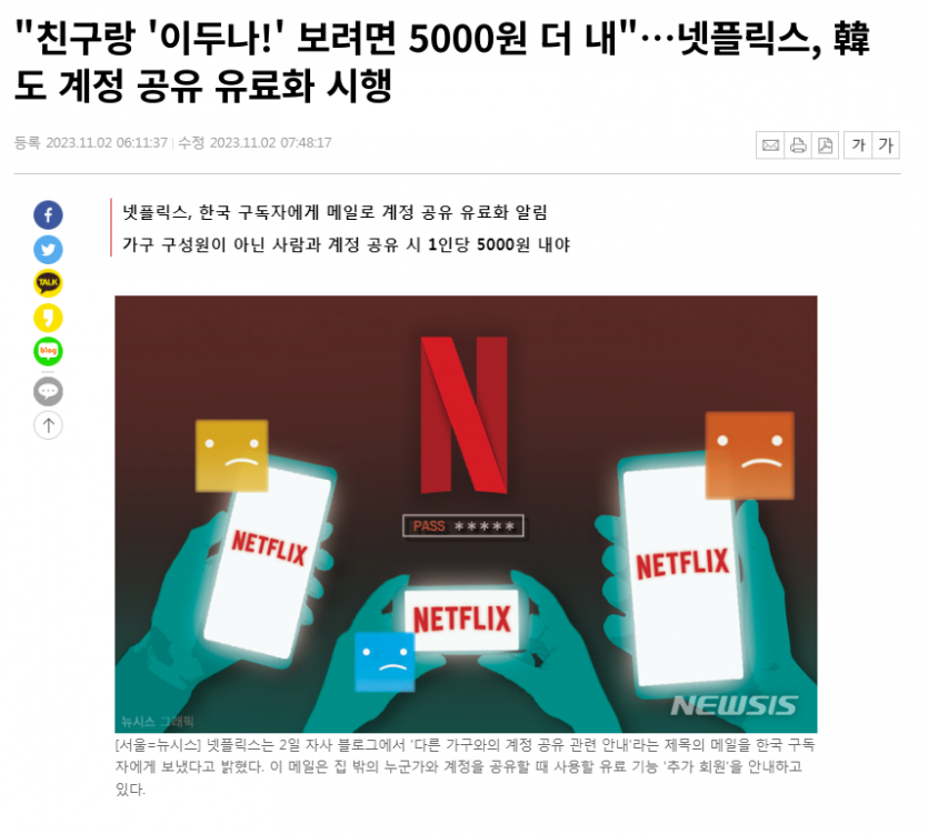 넷플릭스, 한국도 계정 공유 유료화 시행....