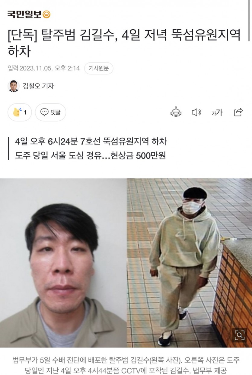 탈주범 김길수, 4일 저녁 뚝섬유원지역 하차 현상금 500만원