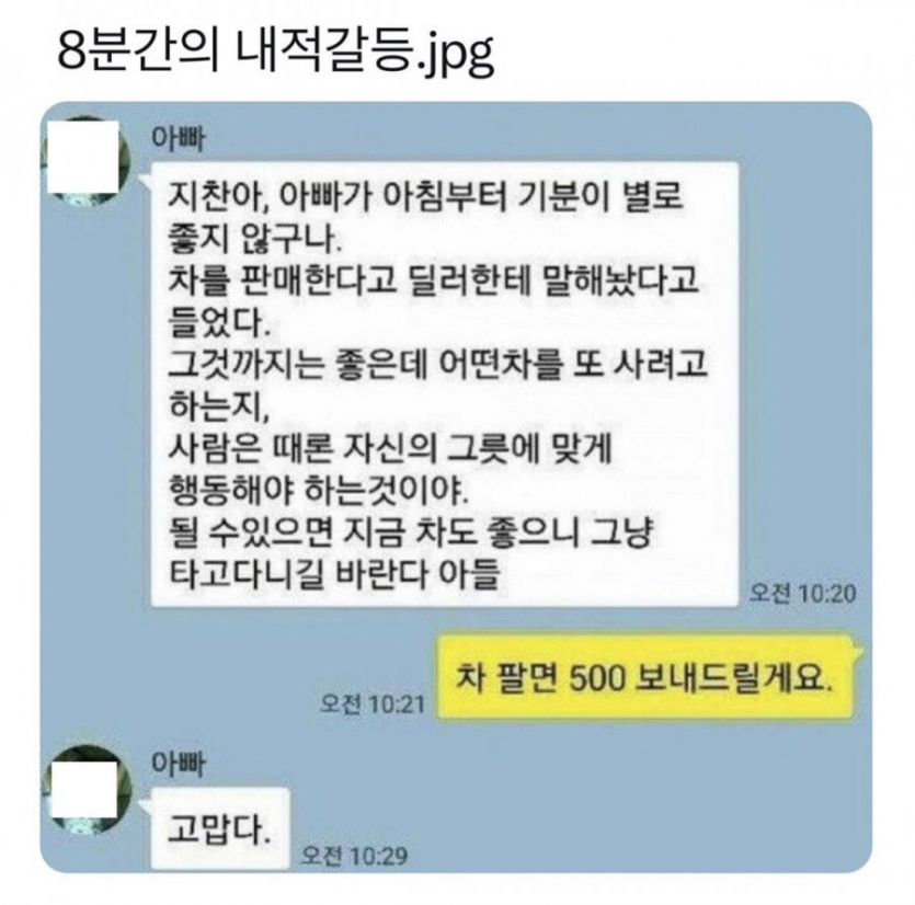 아버지의 말슴 사람은 그릇에 맞게 행동해야한다..8분만에..갈등을 없애 버린아들