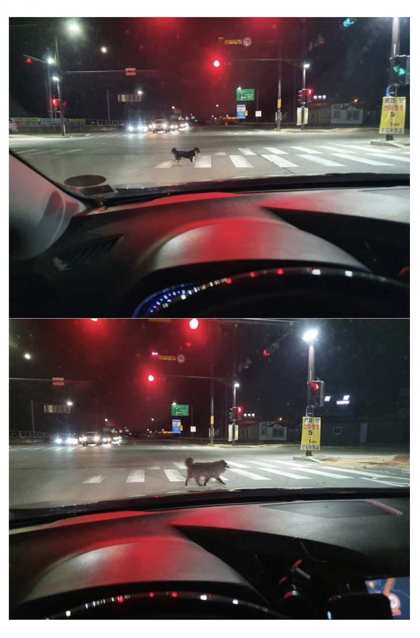 서울 강아지는 횡단보도로 파란불에 다닌다..