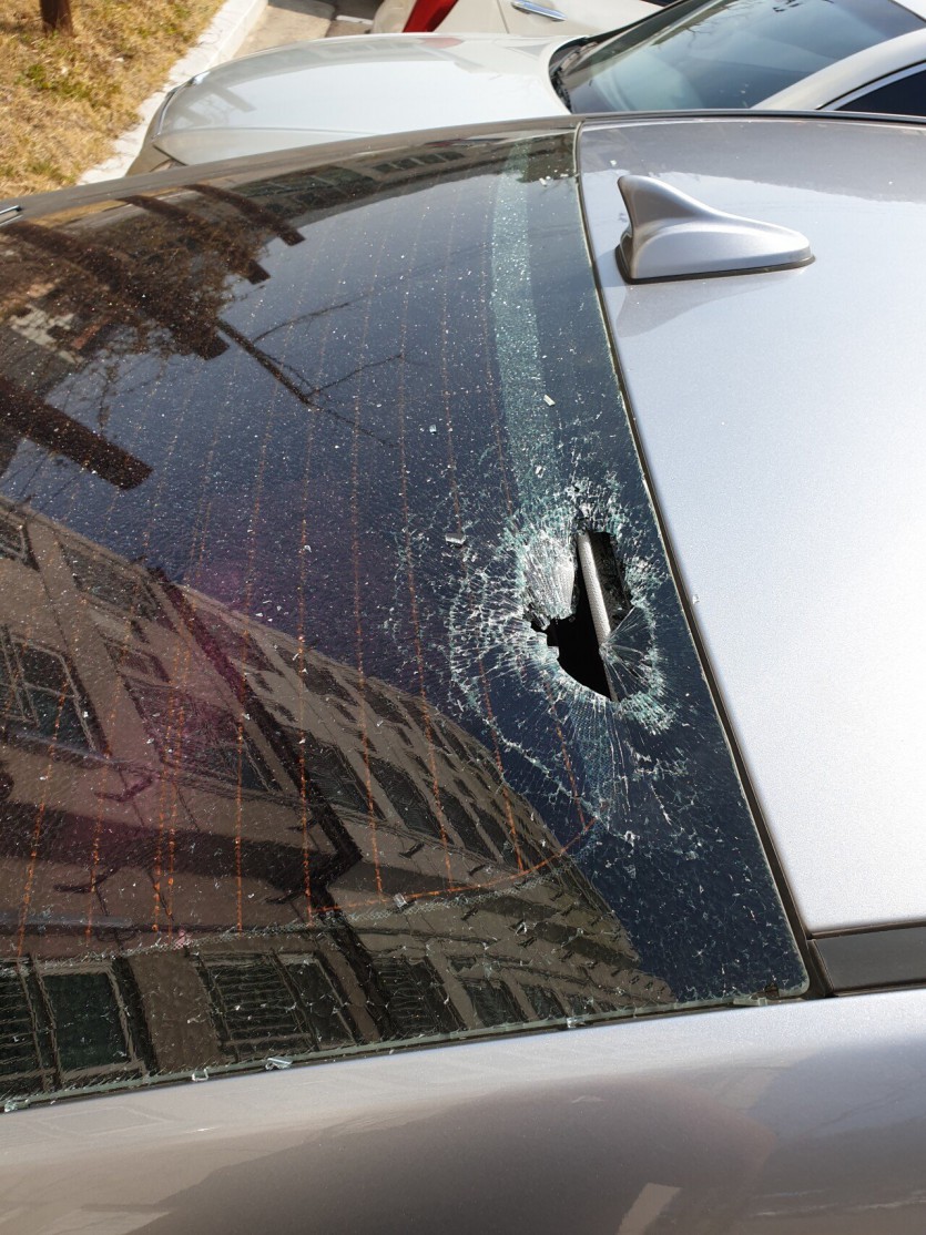 뒷유리 박살나있고 차옆에 왠 여자가 발 동동 구르고 있음