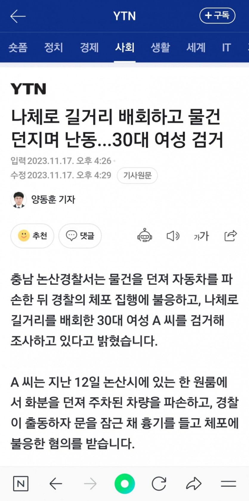 30대 여성 나체로 길거리에서 검거