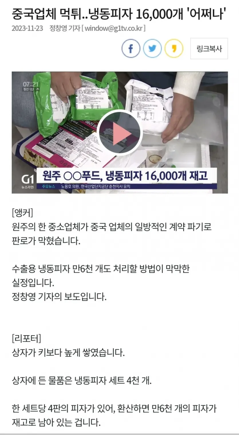 중국업체 계약파기로 냉동피자 16,000개 떠안아버린 한국 업체.jpg