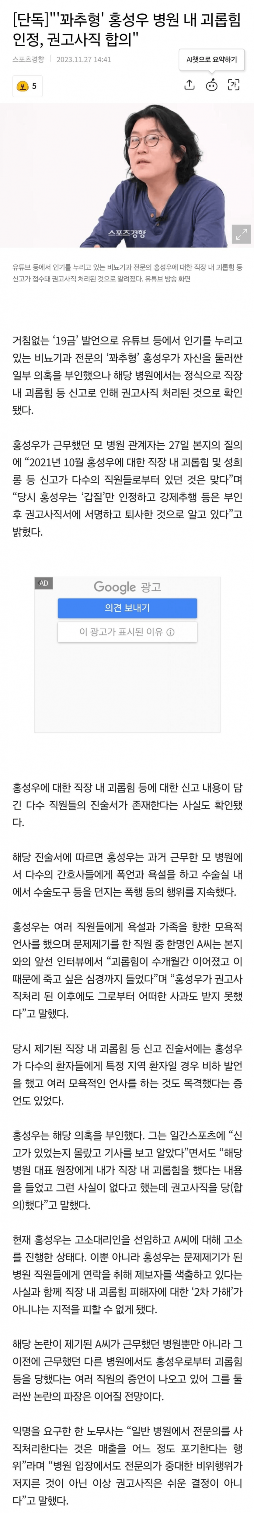 꽈추형, 직장내 괴롭힘 인정. 권고사직 합의