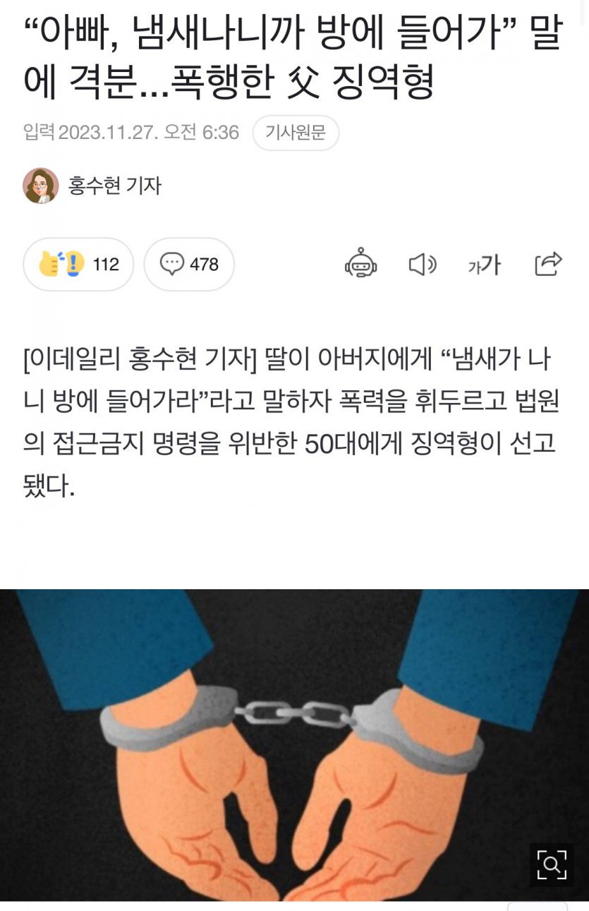 아빠 냄새난다고 방에 들어가라고 말한..딸래미