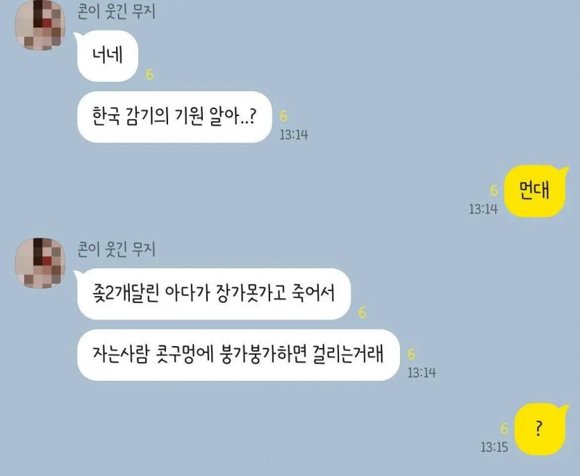 아다가 장가 못가고 죽어서 자는사람 콧쿠멍에 붕가붕가하면 코감기 걸린다.