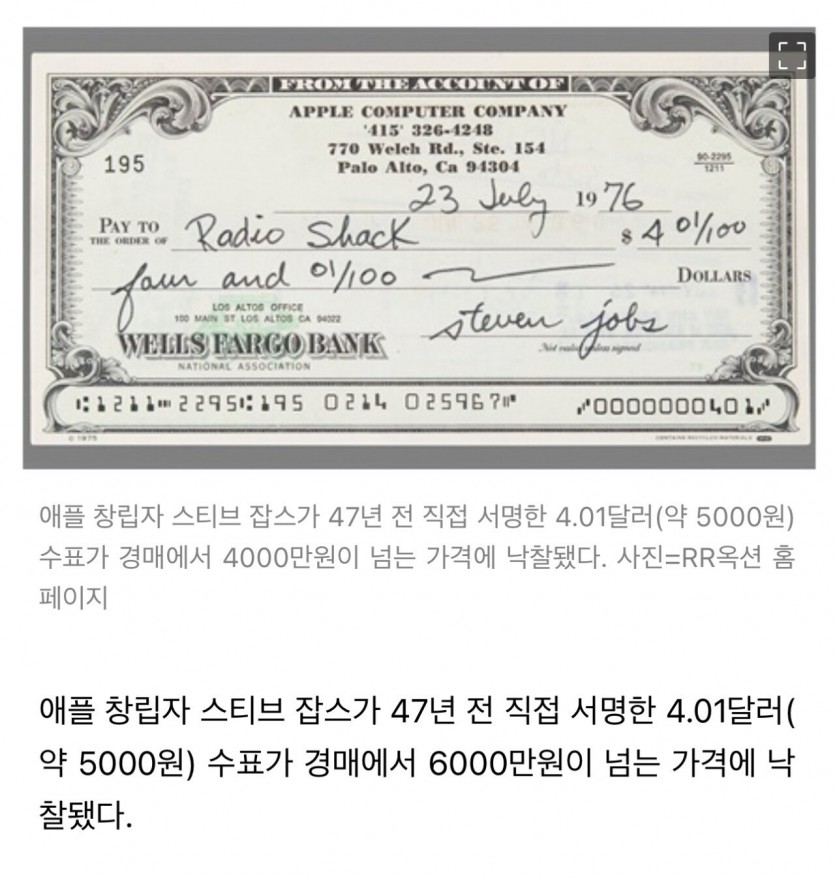 스티브 잡스가 싸인한 4달라..수표 6000만원 낙찰.