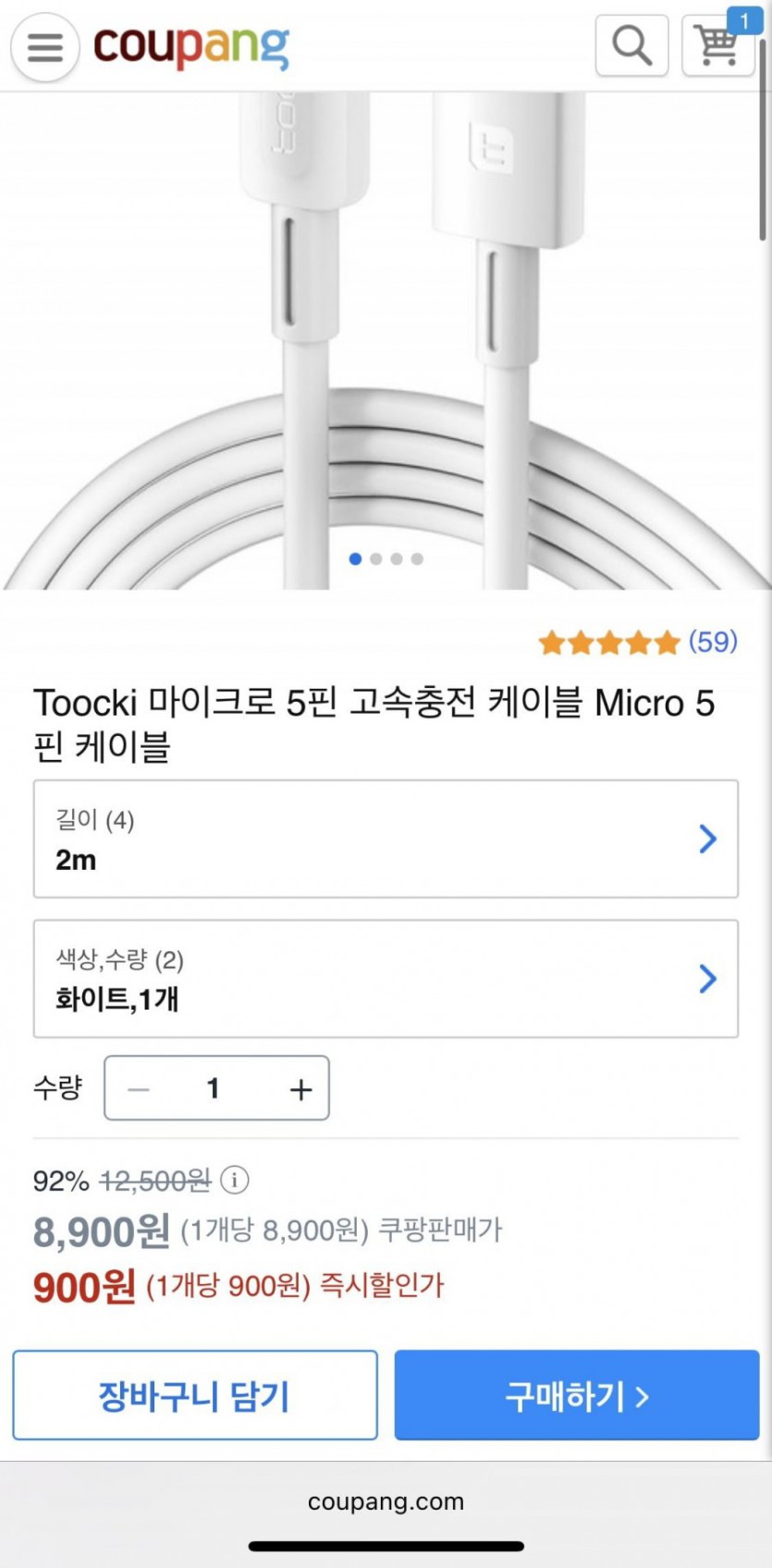 [쿠팡] Toocki 마이크로 5핀 케이블 2m 흰색 (900원/무배)