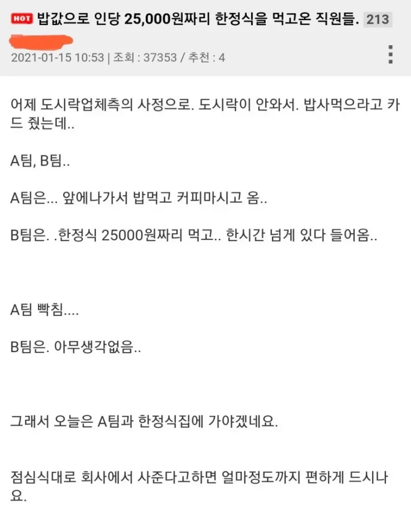 밥값으로 1인당 25000원 한정식 먹고온 직원들