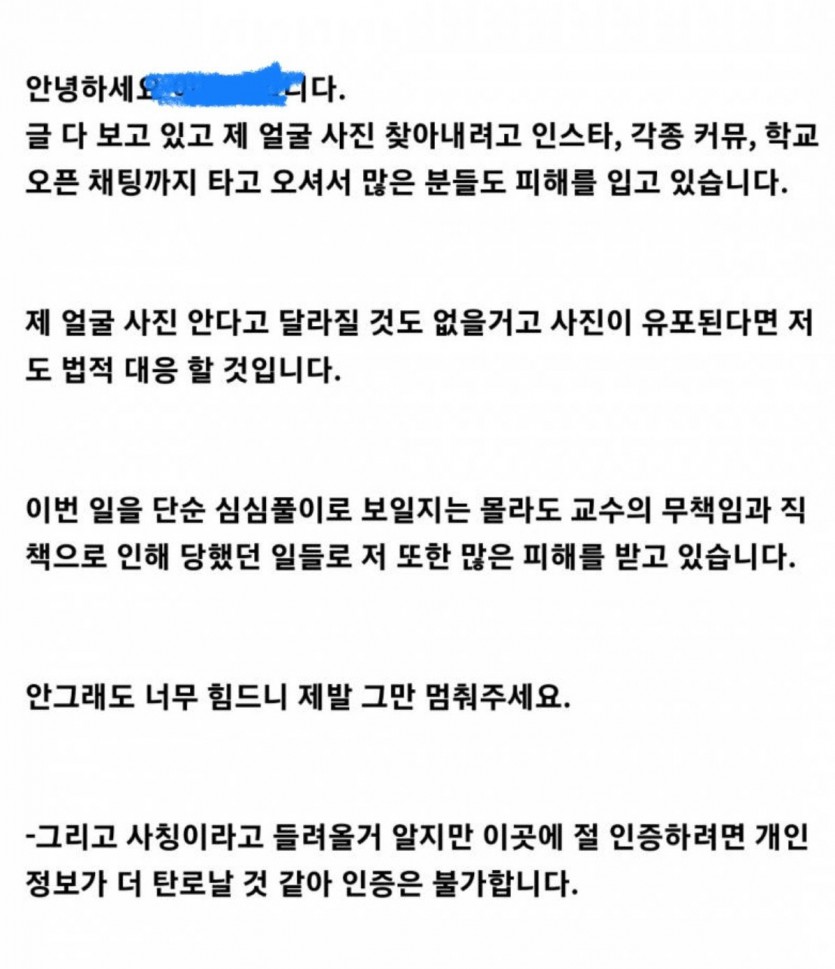 백석대 교수 카톡녀 입장문 공개