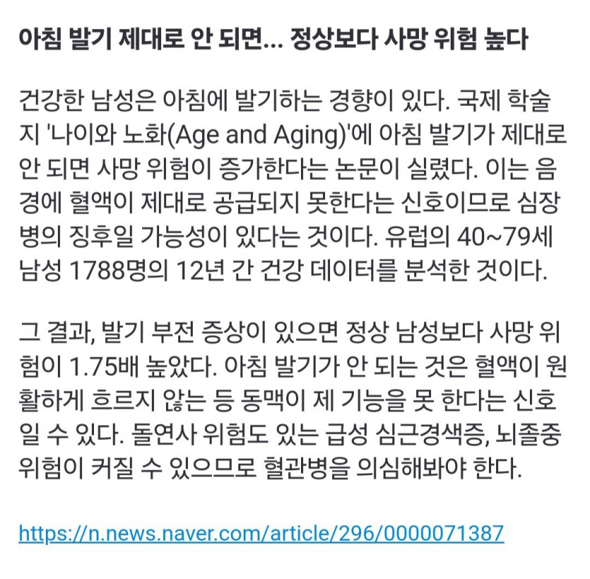 아침에 발기 제대로 안되면 정상사람보다 사망위험 높아요.