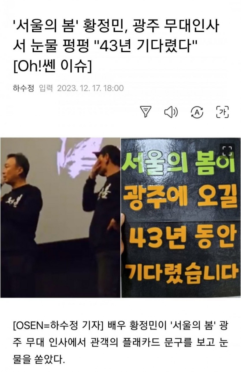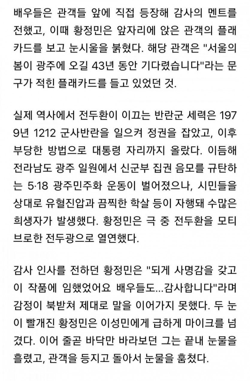 '서울의 봄' 황정민, 광주 무대인사서 눈물 펑펑 "43년 기다렸다"