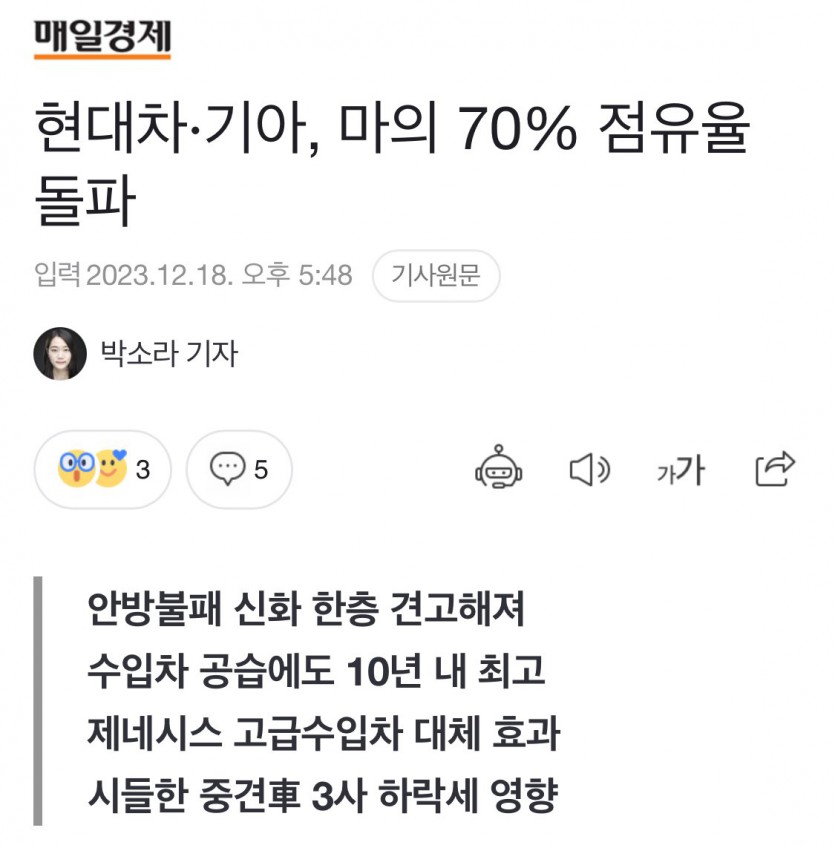 현대기아차 국내 점유율 70% 돌파