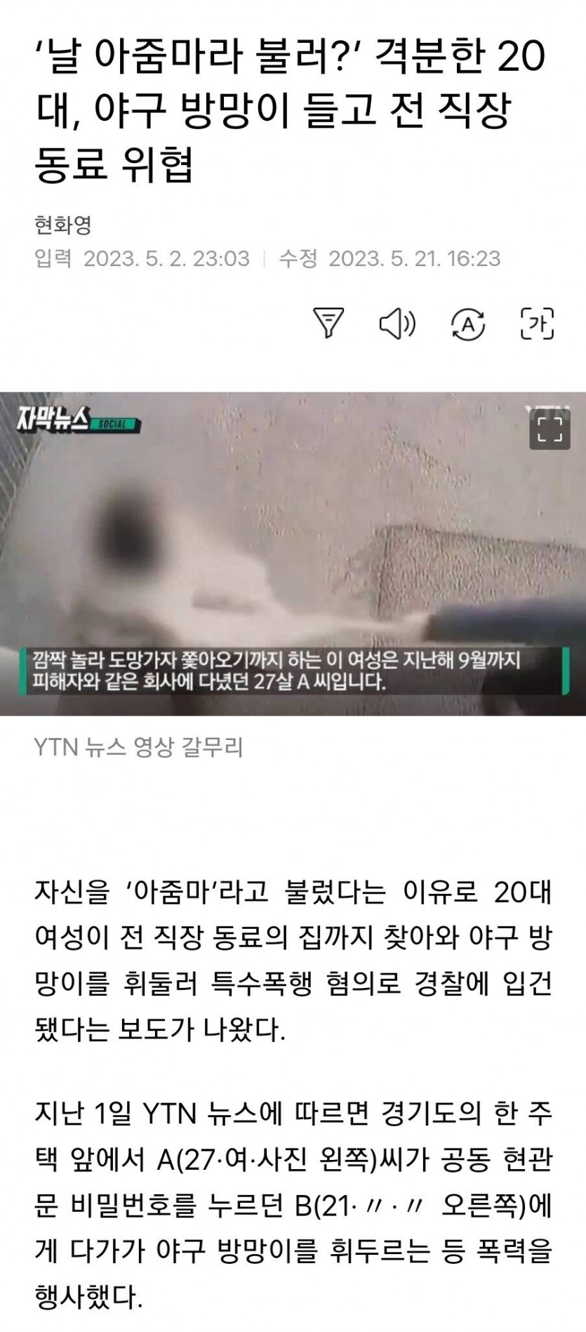 나를 아줌마라 불렀다고 야구방망이들고 찾아간 여성