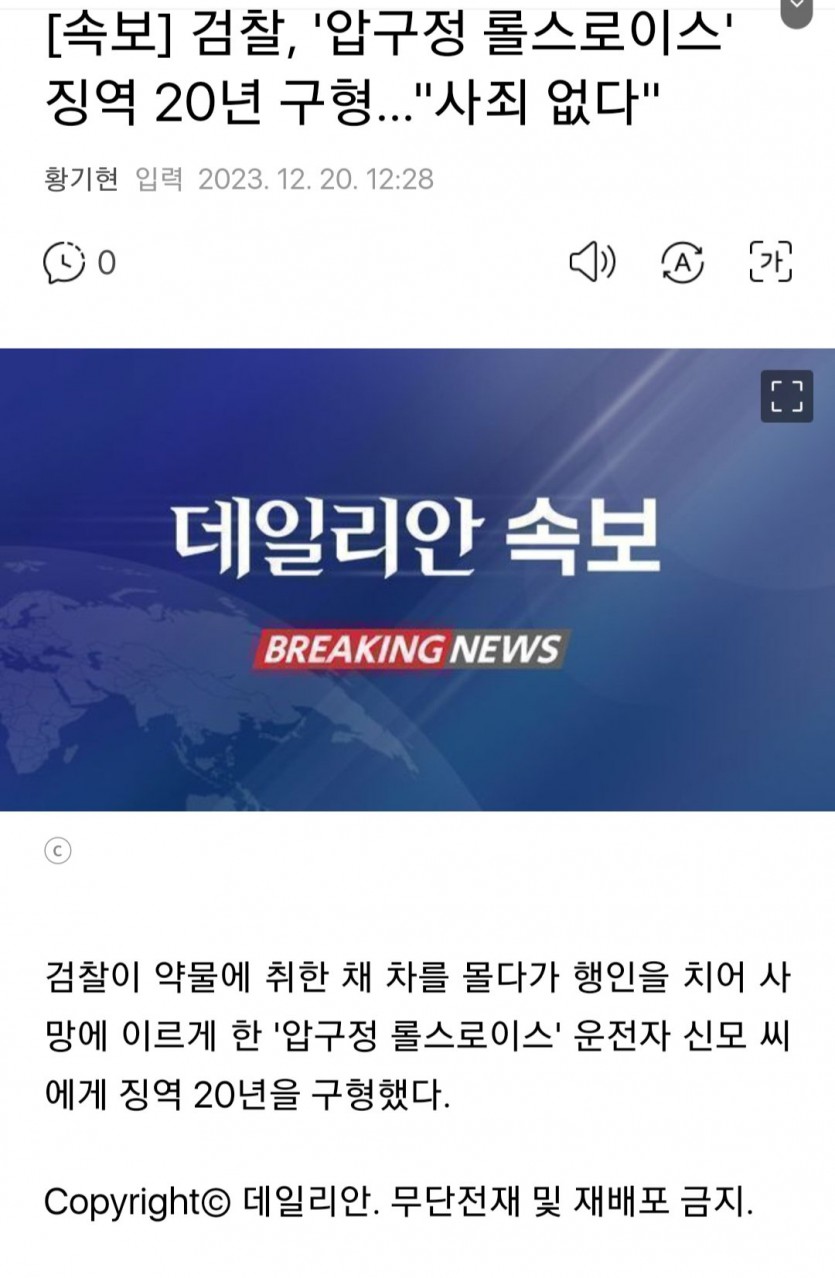 [속보] 검찰, '압구정 롤스로이스' 징역 20년 구형…"사죄 없다"