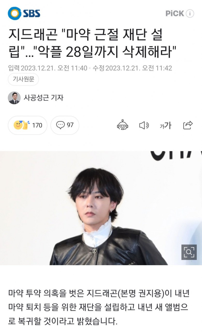 지드래곤 "악플 28일까지 삭제하거나 정정하면 선처"