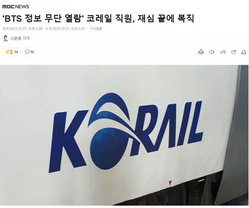 'BTS 정보 무단 열람' 코레일 직원, 재심 끝에 복직